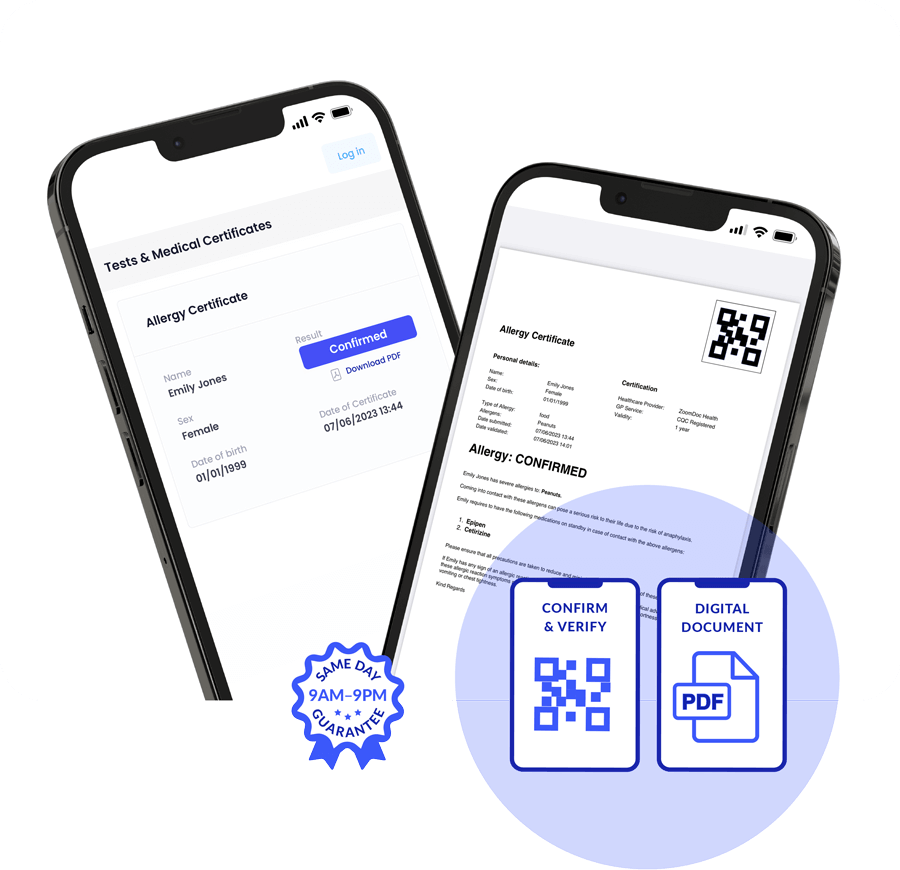 Our doctors can provide you with a same-day medical certificate that will confirm the exact allergen, the signs of the allergic reaction, what you need to avoid, plus the medications you require to have on standby. No appointment is needed — simply apply online.